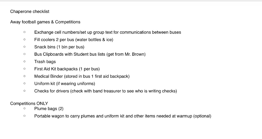 *Documents: Chaperone Checklist, Chaperone Away Game Duties & Details